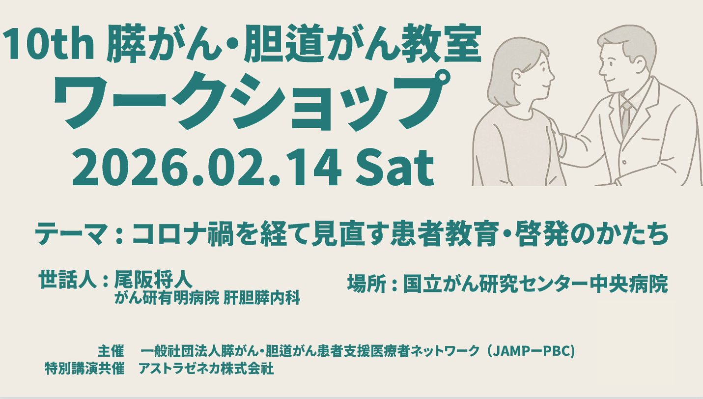 弊社が事務局を務める一般社団法人膵がん・胆道がん患者支援医療者ネットワーク(JAMPーPBC)主催の「第10回膵がん・胆道がん教室ワークショップ」が、7年ぶりに開催されます!